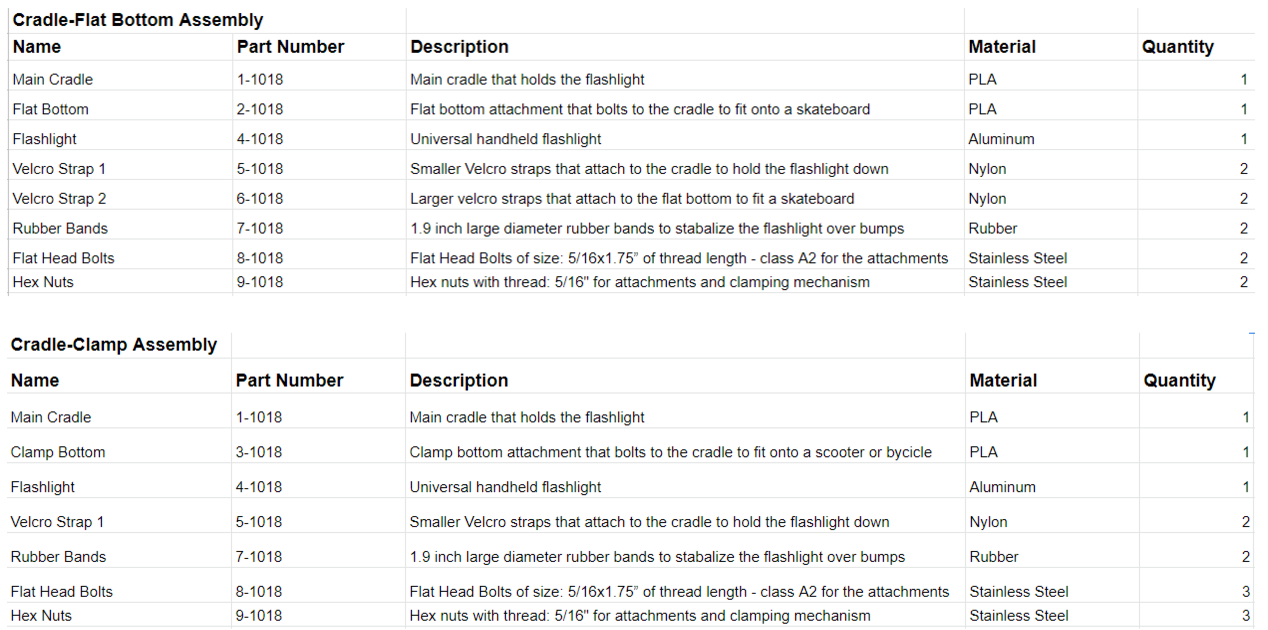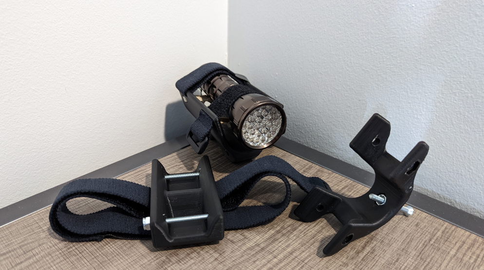 For the E29 final, I helped design the Light Skate, a modular flashlight mount aimed at skateboards, scooters, and bicycles. Parts were modeled in SolidWorks for FDM printing in PLA: the goal was a stiff, universal interface that actually illuminates the path without shaking loose on rough pavement.