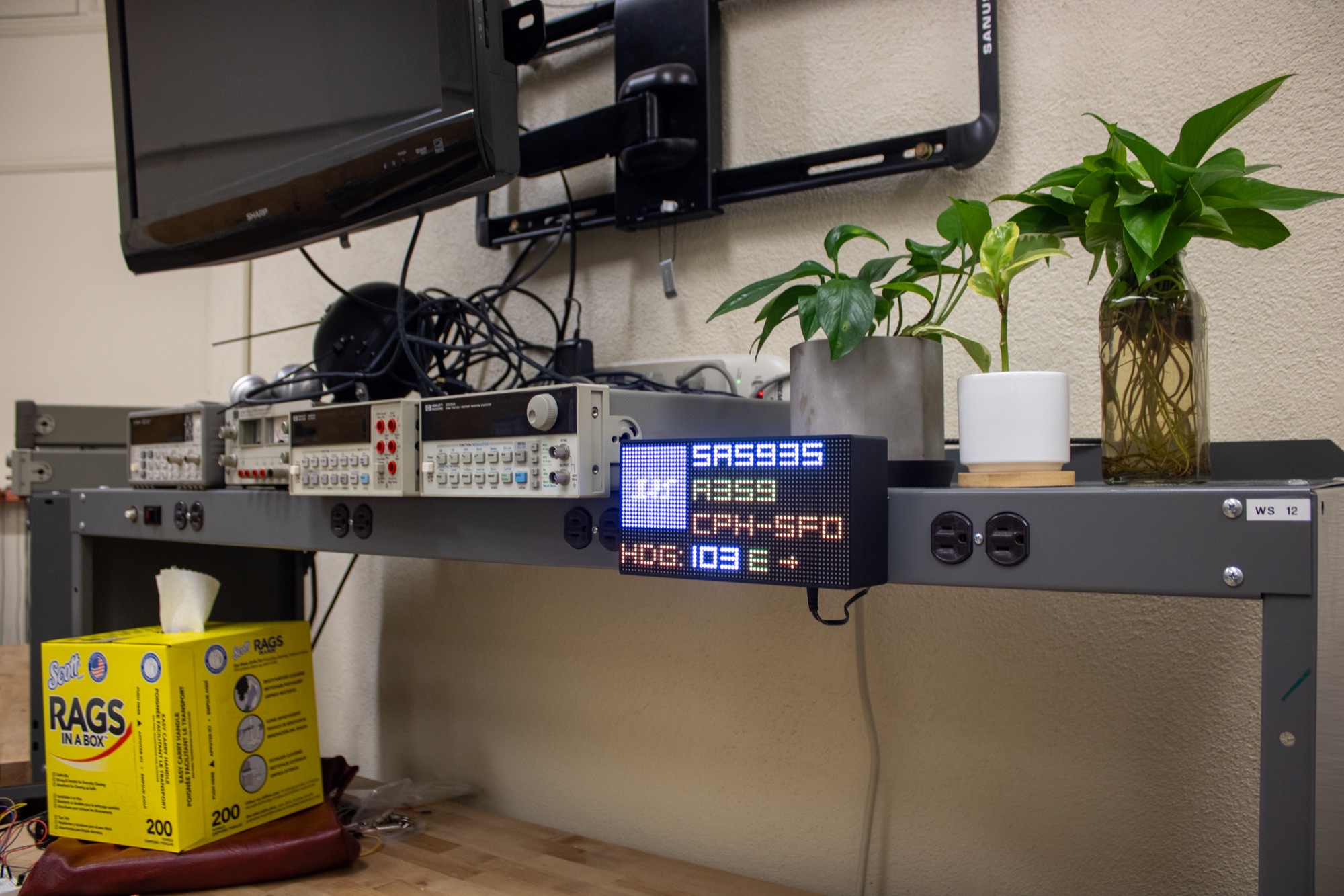 Custom ADS-B desk display: live traffic from the adsb.lol feed on an ESP32 Feather V2 and a 64×32 RGB matrix, with hand-drawn airline glyphs and a wall-or-desk 3D printed enclosure.