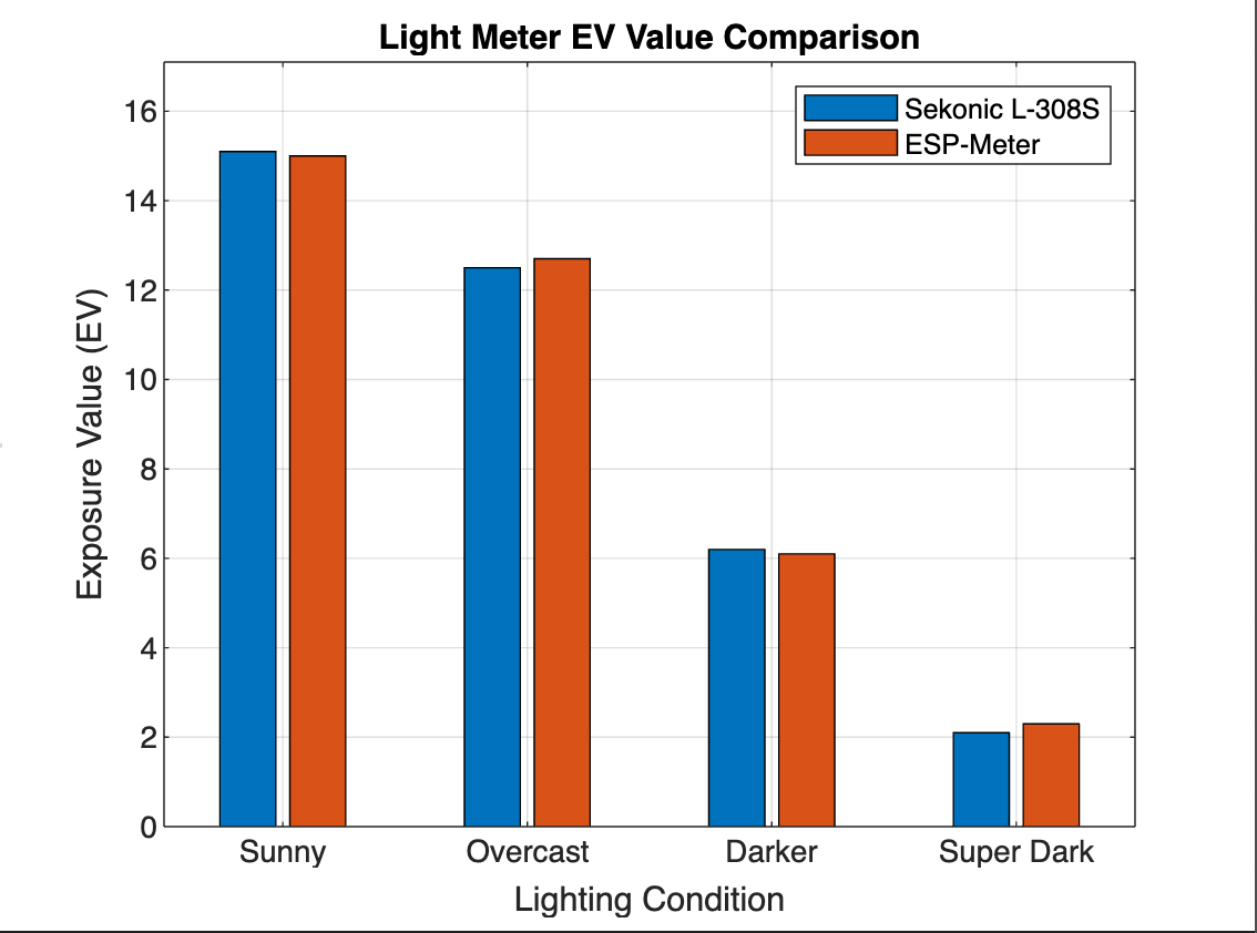 The meter was calibrated and compared against a Sekonic L-308S, a common incident meter priced around $300. In testing, the ESP-Meter tracked within roughly 98% of the Sekonic’s EV readings. Bill of materials lands near $15, on the order of 20× cheaper than the commercial tool, in a smaller package, while remaining accurate enough for everyday film work.